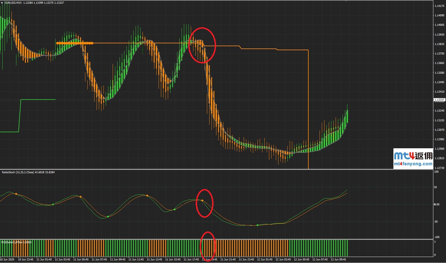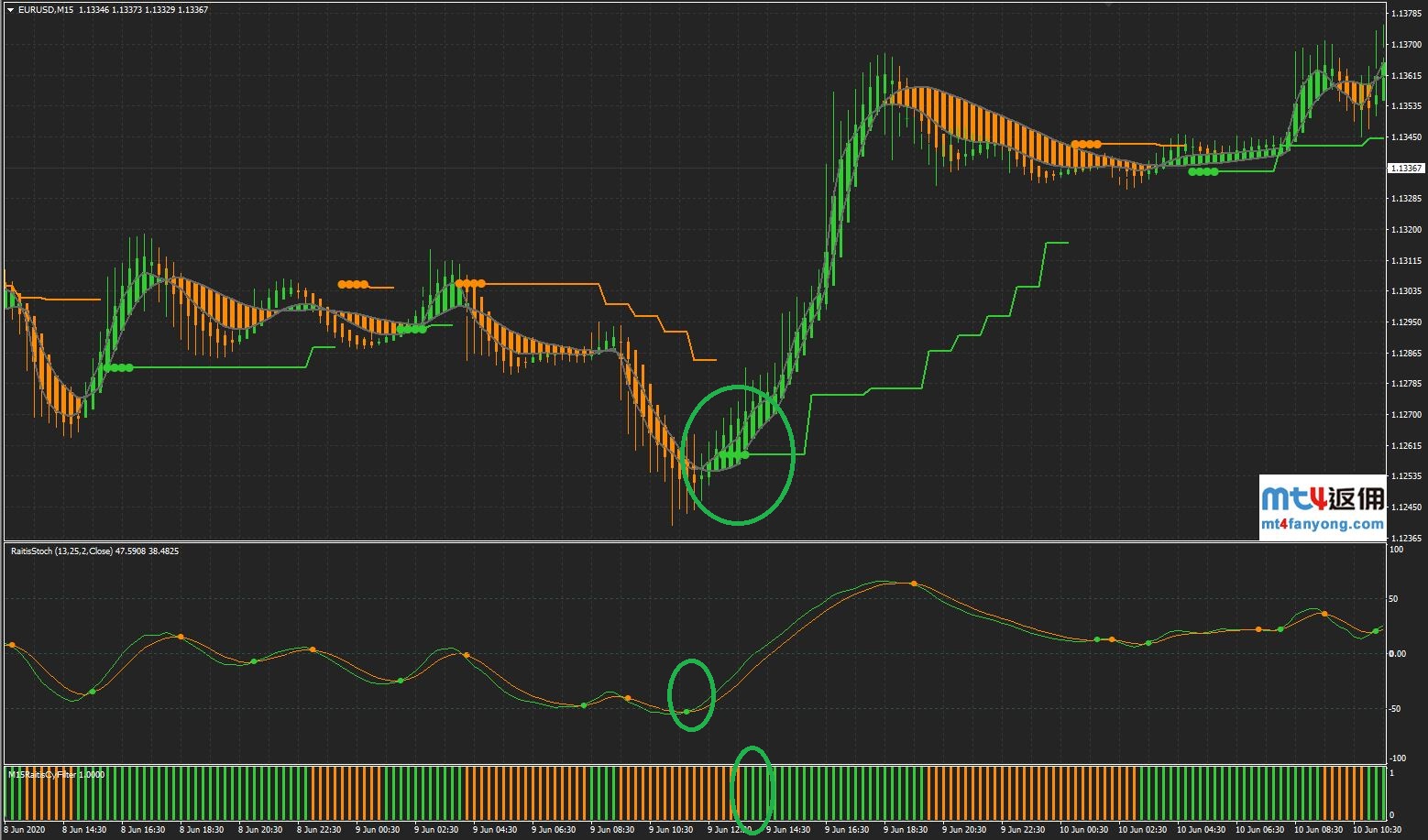 主图出现绿色K线,RaitisStoch指标(次图)出现金叉,RaitisFyFilter指标出现绿色柱,则可以做多;主图出现黄色K先,RaitisStoch指标(次图)出现死叉,RaitisFyFilter指标出现黄色柱,则可以做空