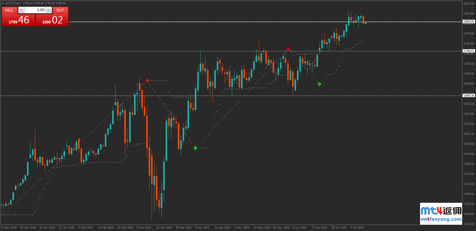 图为黄金日线走势,价格短线回调后测试4月以来高点组成的支撑线,此后价格收于该支撑线之上,预期价格或继续在7月8日以来的横盘区间中震荡,上方阻力见前高1818。