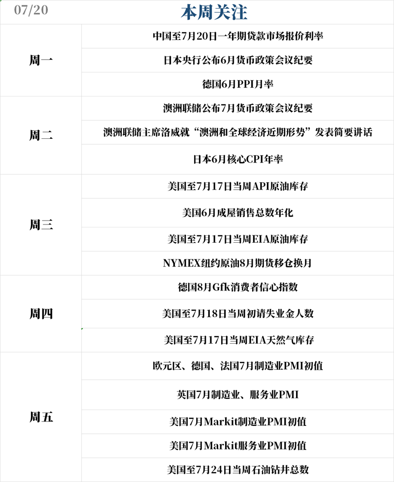 本周数据和事件都较为清淡,投资者主要关注欧美国家7月份的制造业和服务业PMI数据。本周五,欧元区、德国、法国和英国都将公布7月制造业PMI初值,从市场预期来看,7月份的数据有望回升。