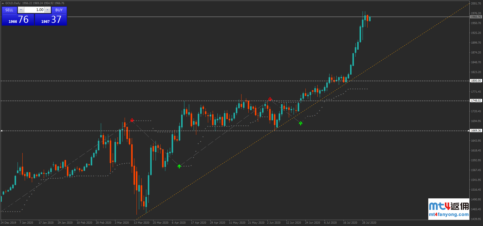 图为黄金日线走势,价格自7月17日测试上升趋势线支撑后持续反弹,已经连续9个交易日收为阳线,且日线收盘价突破斐波那契200%回调位1955水平。若价格进一步走高,上方阻力见2000整数关口。