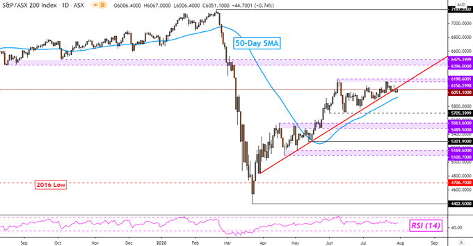 从技术角度而言,继跌破3月底以来的上行支撑趋势线后,ASX200指数可能面临反转下行的风险。不过目前而言该指数尚未取得进一步的进展,因此削弱了价格突破的可能性。若后续澳洲ASX200指数重返上行趋势线上方,则短期阻力关注区间6156-6198;反之,更下方的50日简单移动平均线有望止住指数的下跌。