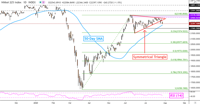 继向下突破对称三角形形态后,日经225指数或面临下跌的风险。对称三角形是一个中性的形态,因此突破的方向往往决定后续的走向。因此,日经225指数后续可能跌向关键的支撑50日简单移动平均线,若破则进一步支撑关注21969。反之,若对称三角形的突破宣告失效,那么日经指数上行的潜在阻力关注区间22965-23178。