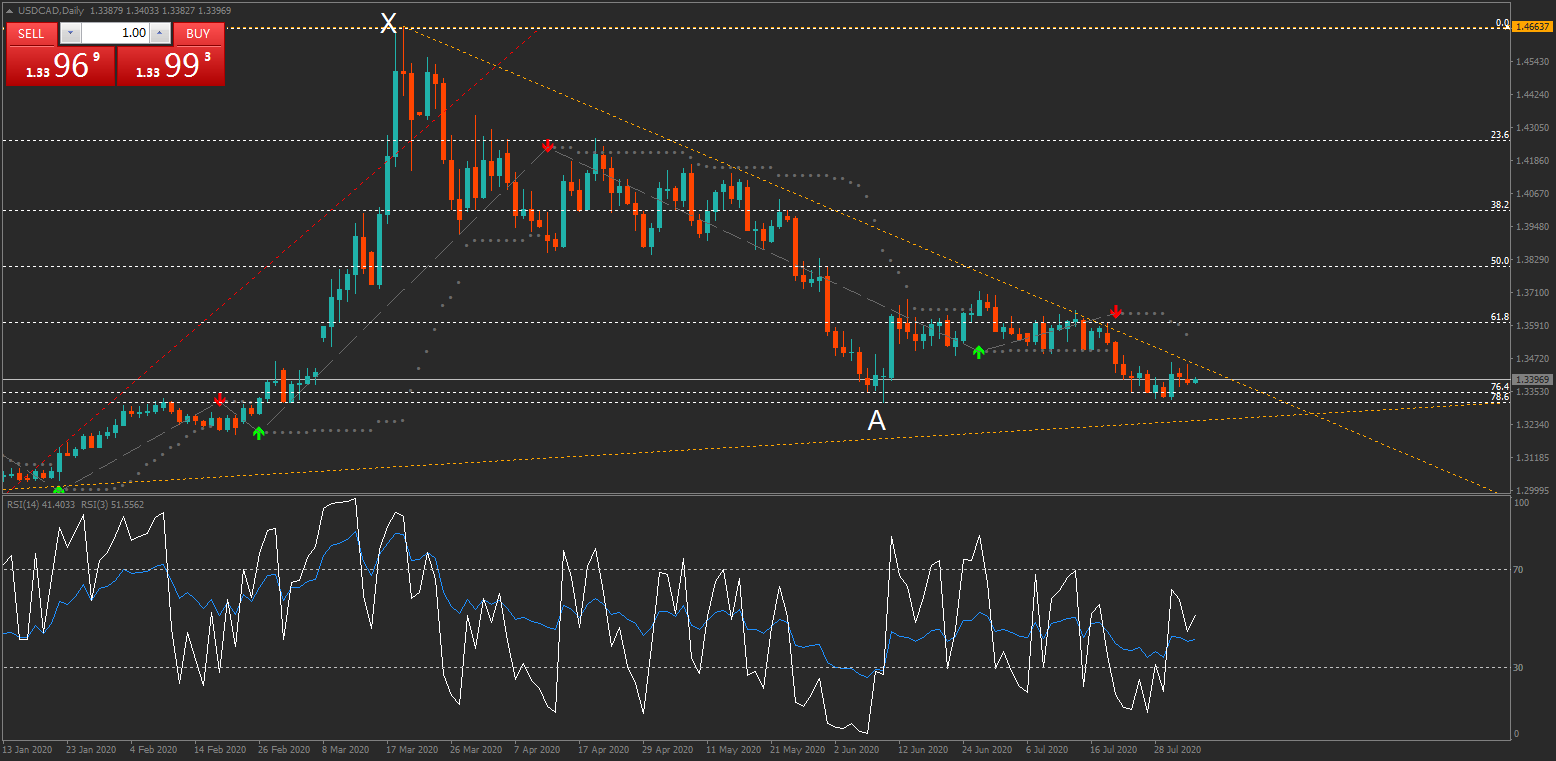 美元/加元的日线图表形态显示,价格维持在3月19日高1.4667(X点)以来的下行趋势线下方,并于6月10日最低下低1.3315(A点)后有所反弹,但未能涨破1.3715附近压力,整体表现疲软。