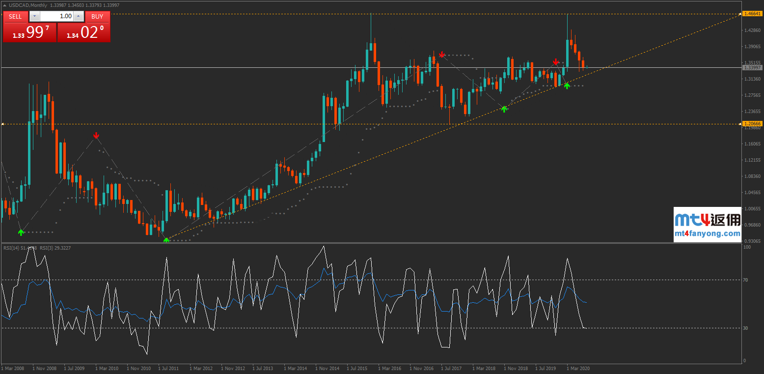 综上所述,美元/加元受阻于1.4667水平后月线四连跌,或不排除在该水平形成双顶结构,但行情受2012年9月以来上行趋势线及1.3315水平的支持而未能进一就扩大跌幅。然而,一旦失守1.3315水平,则恐将引发多周期的连锁下跌反应,长期下行目标或指向1.2关口!日内还需要留意1.3486的阻力表现,如涨破,则不排除测试1.3715附近压力。