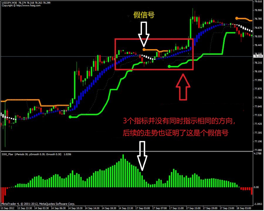 需要注意识别行情当中的假信号。如图所示,这个是非常典型的假信号。此时需要耐心等待行情走势。识别假信号的最重要的在于牢记要3个指标同时指示同一个方向,才可以考虑进场操作。