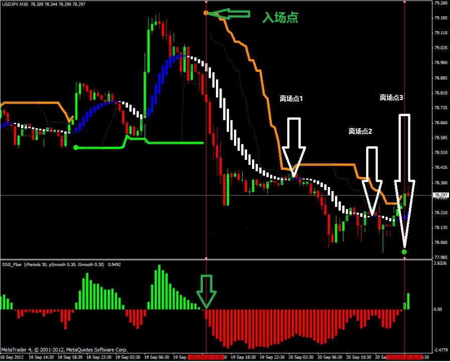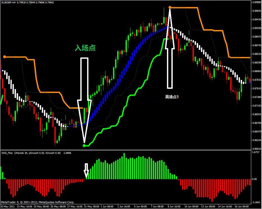 在一段趋势中的回调段(震荡段)是非常好的离场点。或者也可以等待SSG Bline出现明确的反转信号后选择离场。