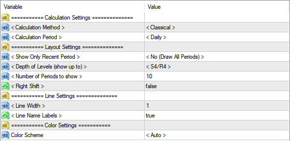 Calculation Method:选择一种PP的计算方法:Classic、Camarilla、Woodie、Fibonacci