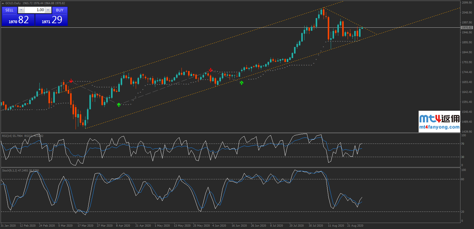 倘若后市金价上涨,最近一个阻力位看向2015,突破后可看向2075。而这或许需要一段时间方能实现,因此新多头或许需要耐心等待黄金重新积累足够的看涨动能。而倘若金价未能涨破楔形上边,则本周的低点1902将仍然是一个有效的支撑位。