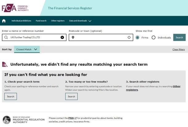 描述:我们在英国工商局官网查询到一家名称为UK FURTHER TRADING CO., LTD,但请注意,有注册不代表有监管,我们在英国FCA官网输入“UK FURTHER TRADING CO., LTD”,查无任何结果!