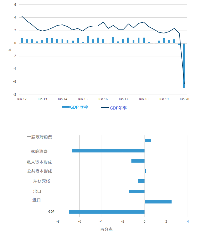 澳洲统计局周三(9月2日)亚市早盘时段公布的数据显示,澳洲第二季度经季节性调整后的GDP季环比下跌7.0%、创历史记录以来的最大跌幅,并且跌幅远远超过第一季度的0.3%以及市场预估的5.1%;GDP同比下跌6.3%、同样创下记录最低水平,并且跌幅也高于市场预估的5.1%以及第一季度录得的1.6%增长(从1.4%修正)。差于预期的数据公布后,澳元应声下跌、澳元/美元短线急跌20余点。