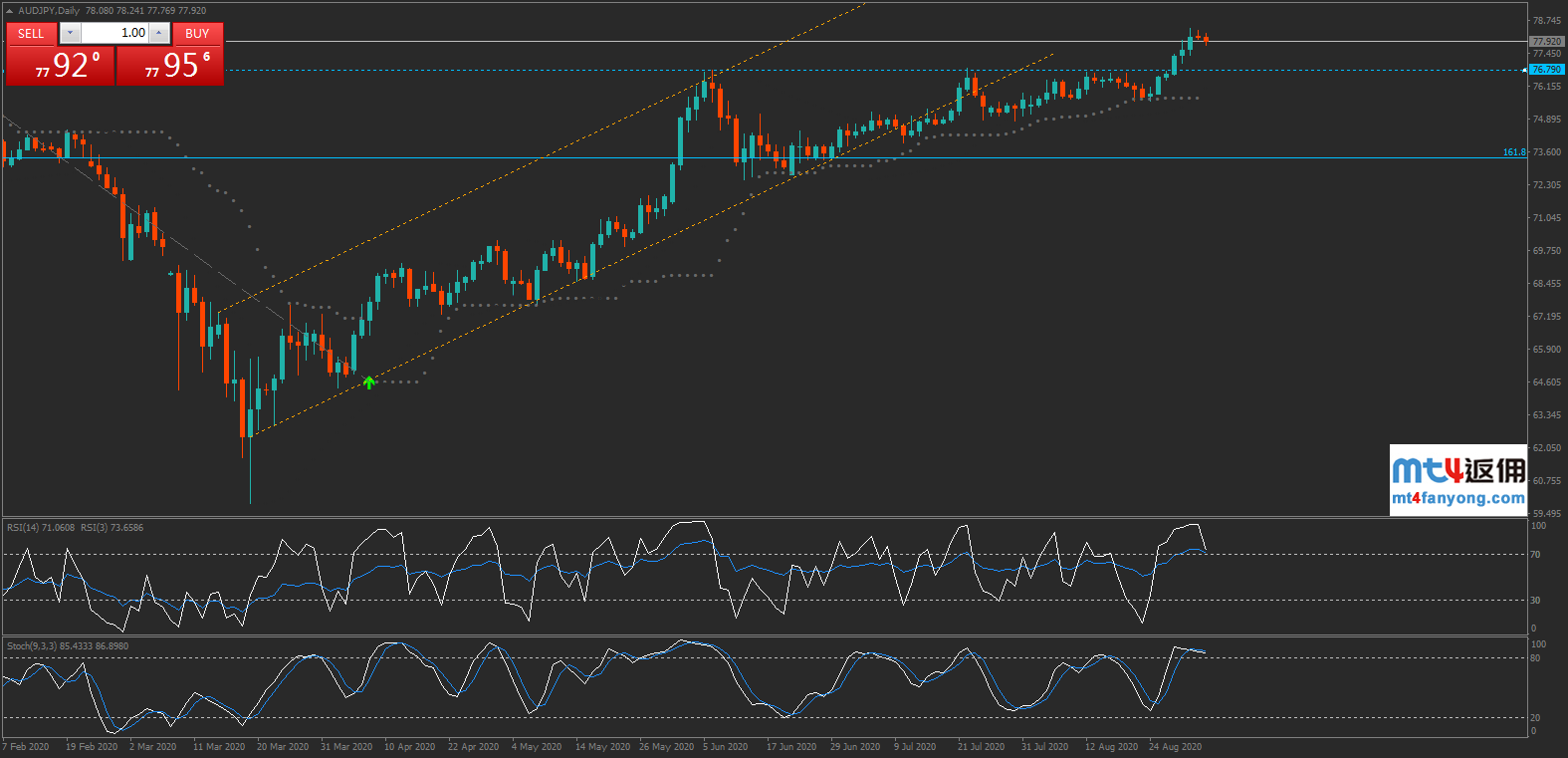 澳元/日元走势与澳元/美元类似,上周突破近期交投区间后进一步上行、最高触及78.46一线。不过与此同时,RSI指标与价格走势呈现背离的迹象并自超买区间回落,暗示上行动能正在减弱,警惕短期价格回落的风险。