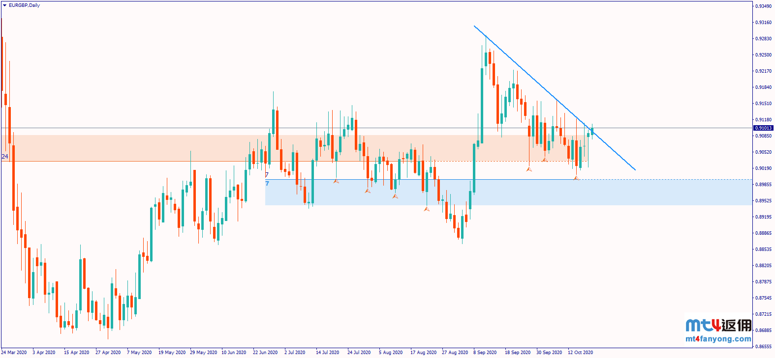 欧元/英镑在9月初创下多月高点0.9258后一直受制于一条陡峭的下行压力线。汇价或将试图突破下行趋势,倘若短线上有反弹信号,或将鼓励买压大幅上升,从而推动价格成功上破。尽管如此,欧元/英镑或将在0.9190的阻力位受到强大压力。