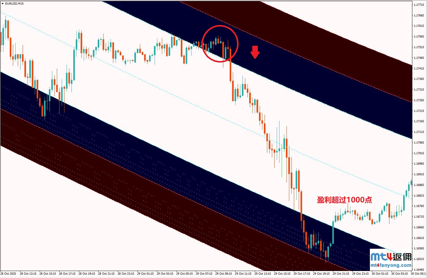 Trend Line Channel的曲线倾斜向下,在价格接触曲线通道顶部位置时,入场做空