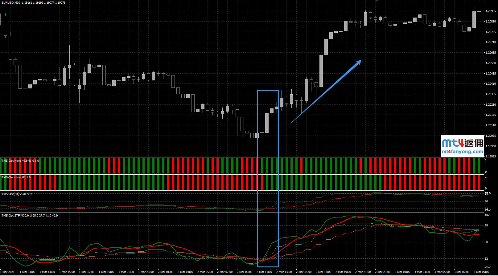 TMS趋势方向指标两者都为绿色;TMS多时间框架指标(H1)绿线从低位上破红线;TMS多时间框架指标(2TF)绿线从低位上破其余三条线。