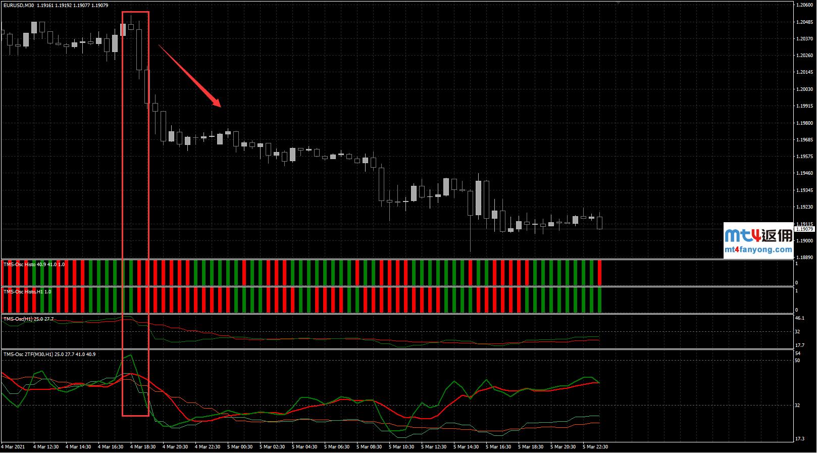TMS趋势方向指标两者都为红色;TMS多时间框架指标(H1)绿线从高位下破红线;TMS多时间框架指标(2TF)绿线从高位下破其余三条线。