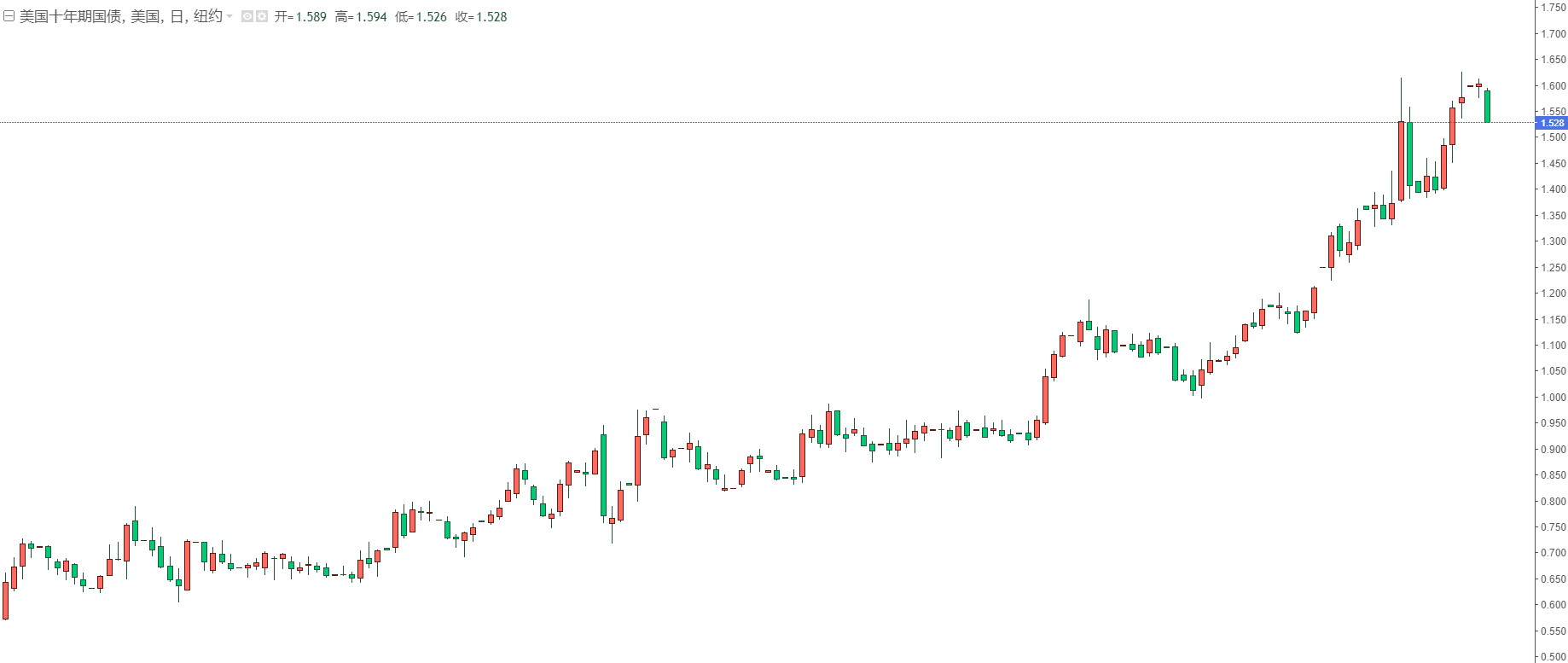 而得益于美债收益率回落,美国三大股指普遍收涨,其中纳斯达克综合指数收盘上涨464.66点,涨幅3.69%,创四个月最大单日涨幅!美元指数回落至92.0、非美货币纷纷反弹,黄金自9个月低位1676美元大幅反弹逾40美元至1720美元。值得留意的是,美国财政部还将于周三、周四分别发行380亿美元10年期国债以及240亿美元30年期国债,预计美债收益率或将受累进一步回落。