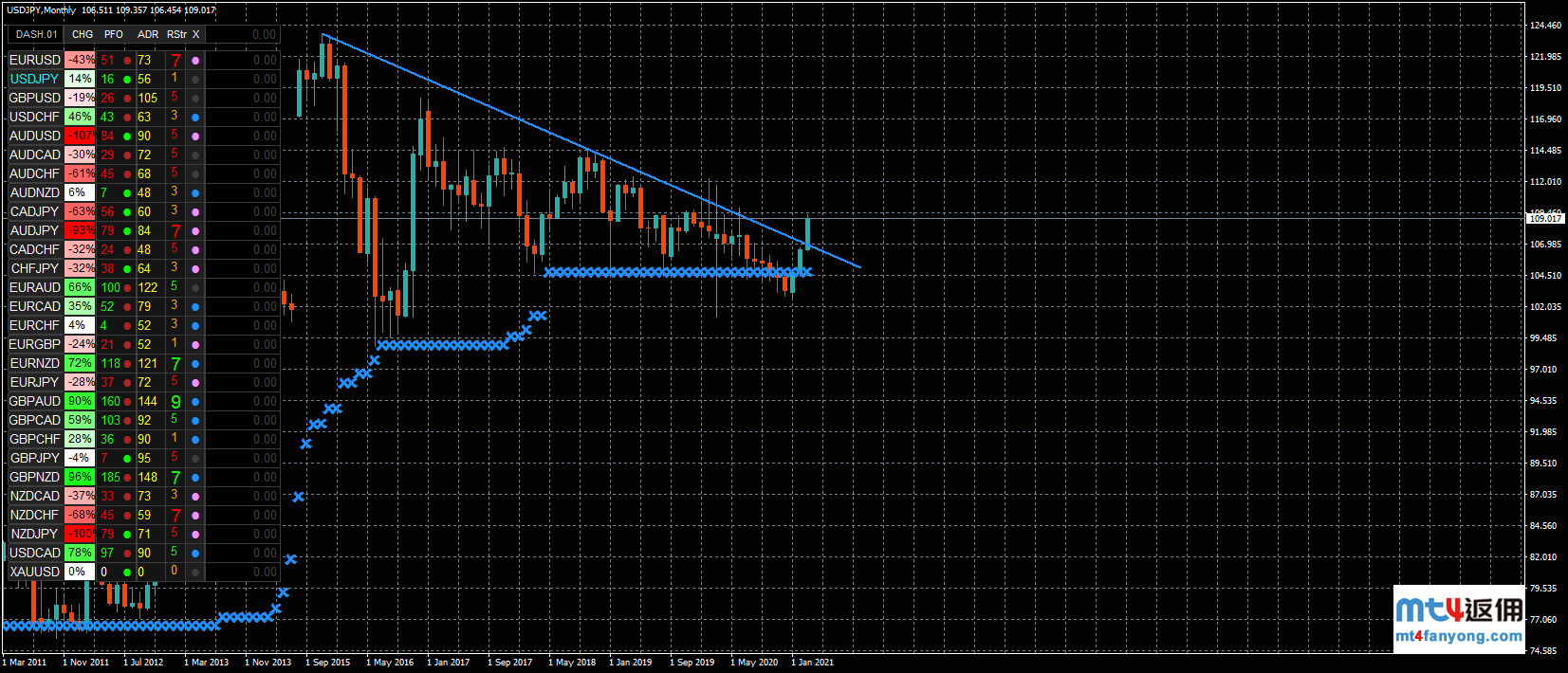 不过,美元/日元走势却没有多大变化,该主要货币对在一个重大阻力水平(109.00关口左右)停滞不前。美元/日元的走势已经开始缺乏方向,买盘压力目前正跟一条维持多年的下降趋势线相抗衡。这条向下倾斜的趋势线穿过了2015年6月、2015年8月以及2020年2月的波段高点。