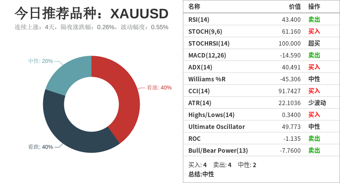 国际黄金(上涨:4天,隔夜涨跌幅:0.26%,波动幅度:0.55%)。