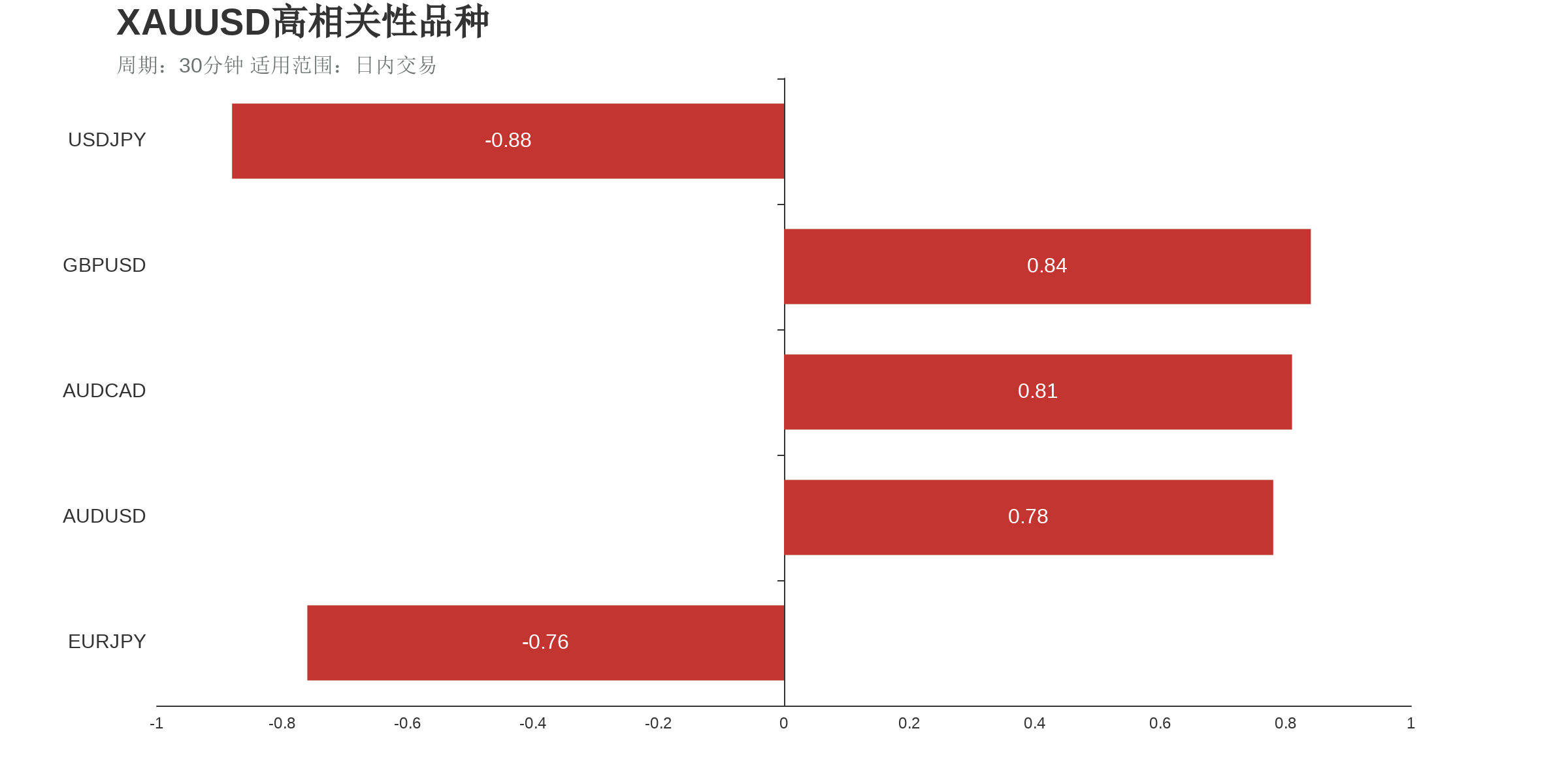 根据外汇相关性实时追踪,XAUUSD在30分钟周期下与部分货币的相关性排行如下图: