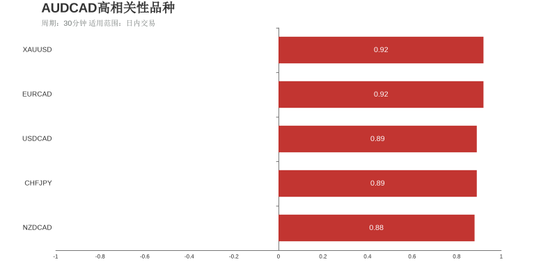 根据外汇相关性实时追踪,AUDCAD在30分钟周期下与部分货币的相关性排行如下图: