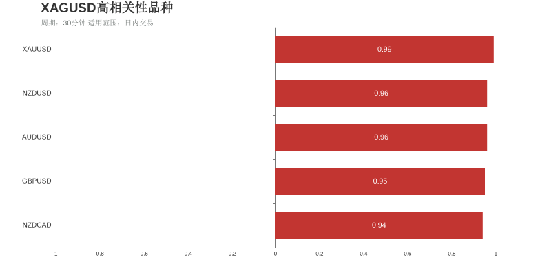 根据外汇相关性实时追踪,XAGUSD在30分钟周期下与部分货币的相关性排行如下图: