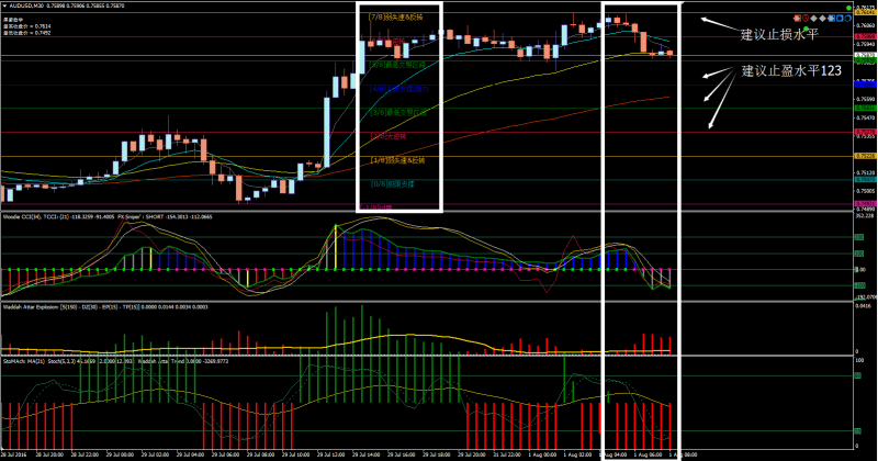 2. 做空时机:出现红色蜡烛图(如果低于移动平均线组合最佳,不强制); 复合型CCI指标(Woodie CCI)多线下行(如果下破零线水平最佳,不强制),水平位出现红点(必要条件)且动能柱转为红色(不强制);趋势强度指标(Waddah Attar Explosion)为红色动能柱且上破黄线(如果之后黄线上行最佳);复合型随机指标(StoMAch)绿色双线下破黄线且出现红色动能柱。趋势反转行情可参考复合型水平位指标的提示。