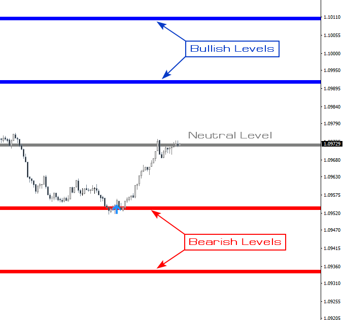 顾名思义,该指标基于价格水平,这些是用于开立买入/卖出订单的点。指标实时计算下一个价格将达到的市场水平。红色看跌水平用于买入信号,蓝色看涨水平用于卖出信号: