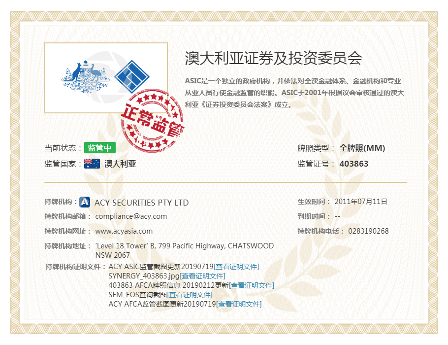 ACY Securities Pty Ltd受澳大利亚证券和投资委员会监管和许可(ASIC AFSL: 403863 )。ACY稀万和SynergyFX兴集经过6个月的内部整合,已正式合并并成立ACY稀万证券(ACY Securities)。