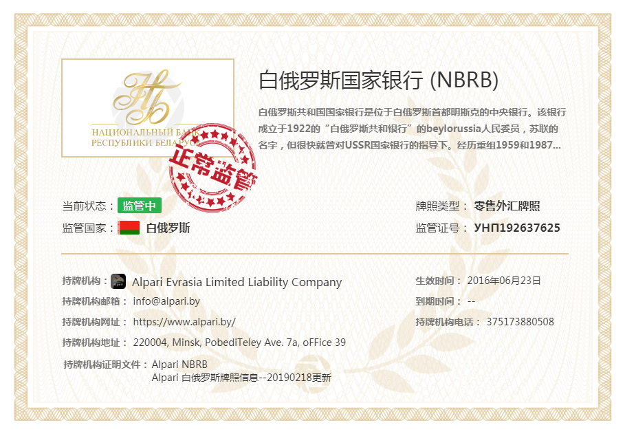 - 监管机构:NBRB